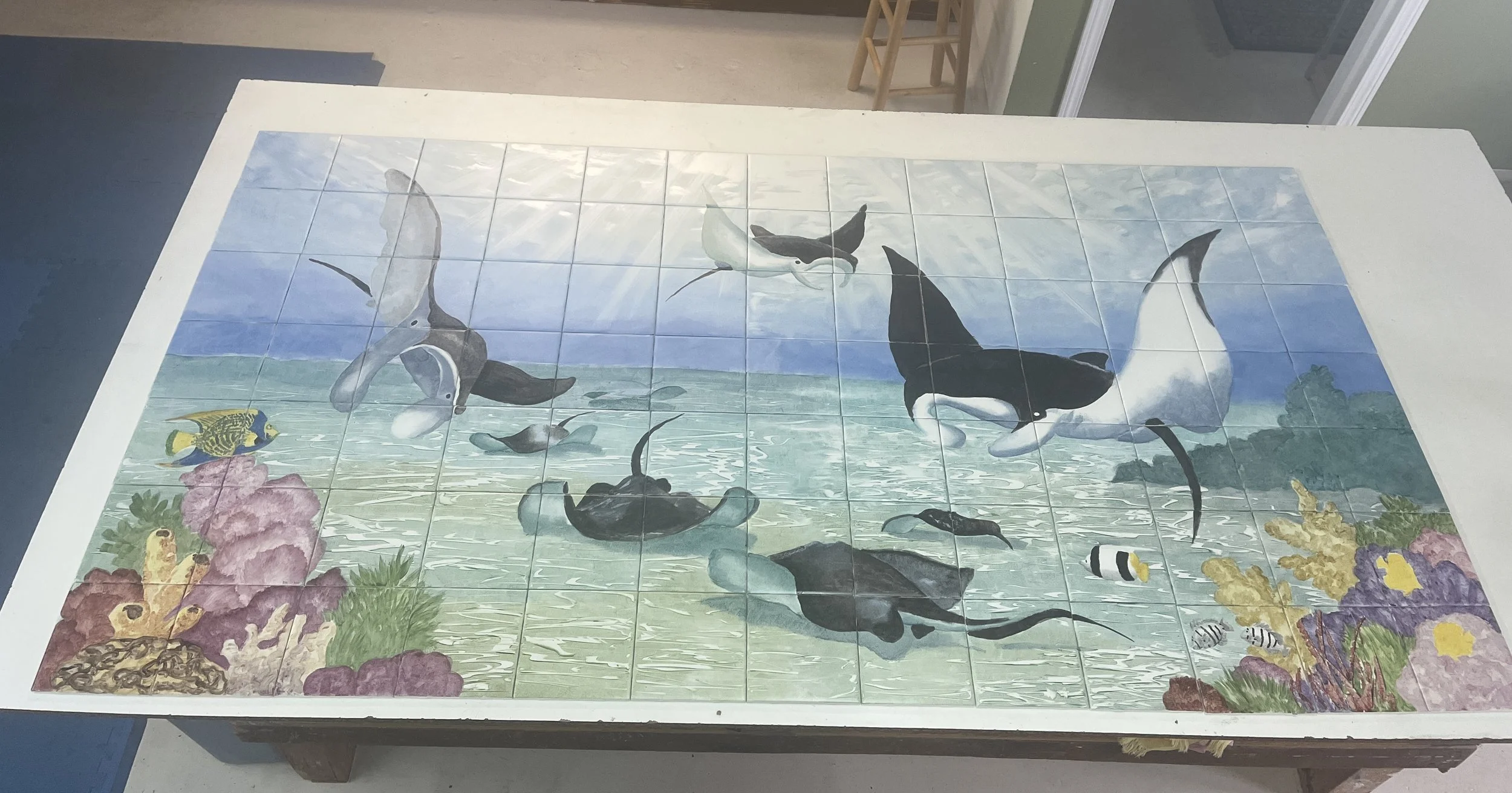 Here’s what the Mantas bespoke tile mural looks like after the second firing. You can see that the background is now filled in, the colors have been deepened and texture has been added. There will be at least one more firing. The next one will be black outlines, and deepening colors even more. I’m liking it so far. I particularly like the way the sunlight beams through the water and plays on the sand.