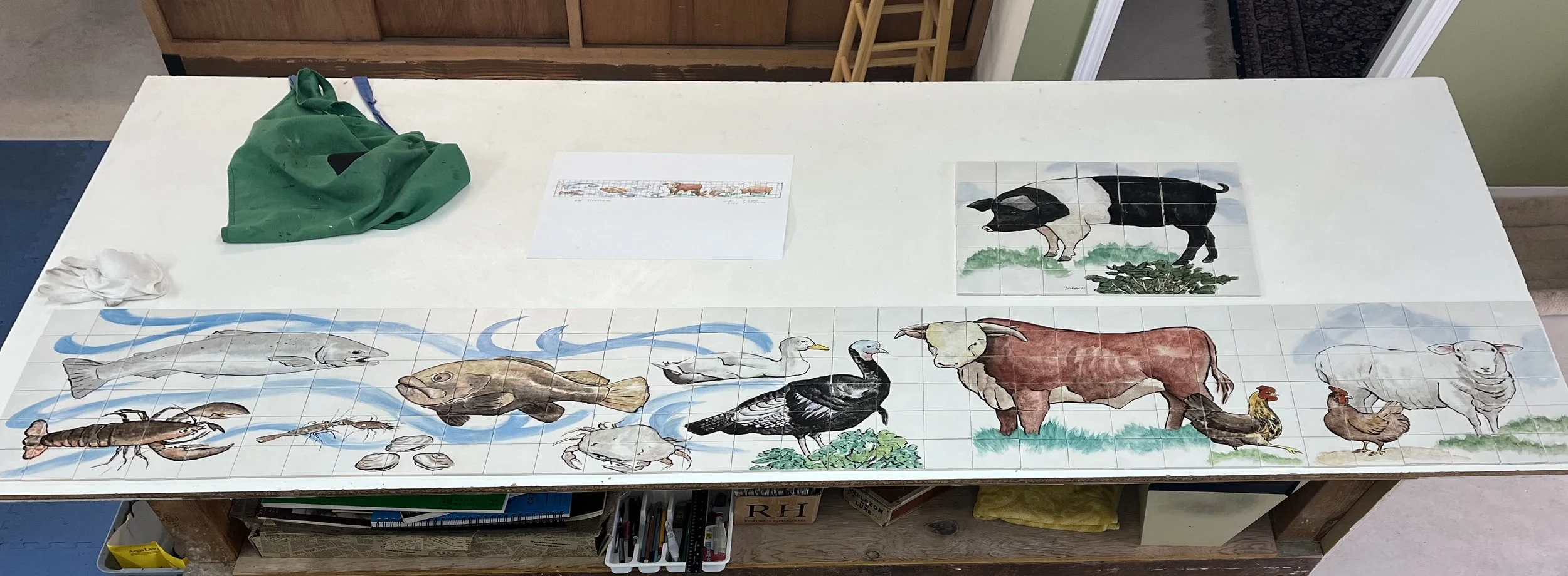 These tiles will go on the outside of an outdoor fireplace. They’re painted on 3” tiles because the end of it is rounded, in a tight enough curve that they needed to be that small. It’s 3’ straight on either side and the middle 4’ of this will be the rounded end. I hate working on 3’ tile. There are just so many of them to number and keep track of and, at least in this case, they come on a sheet held together by dots of glue. I try to cut off as much of the glue as I can because it smells so horrible when I fire it. And I have to do a separate firing to burn the glue off because the burning glue will affect some of the china paint colors. But I like the image, which is all animals that are likely to end up on the grill. The pig goes to the right of the sheep.