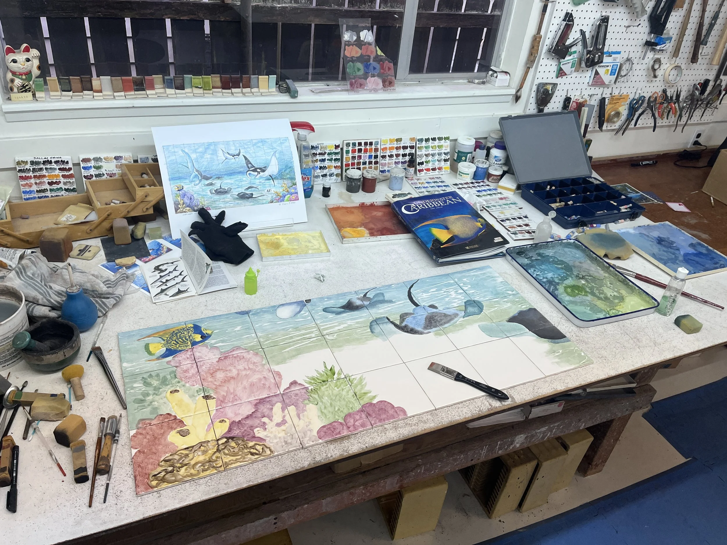 This is how a custom tile mural starts and how it comes out. The client gives me the measurements of the space, and any images or descriptions they can round up to tell me what they want it to look like. I then make them a scale drawing so we can see how it fits into the space. In this case, I needed to work around an outlet. This lady came from a family of Northwest fishermen, so there’s lots of seafood in it, and she wanted it fun and whimsical. She gave me some pictures and I used my very extensive library of images on all kinds of subjects. Then I fire it onto the tile we select, and she’s happy.